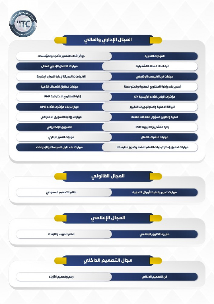 دورات المجال الإداري والمالي، القانوني، الإعلامي والتصميم الداخلي.